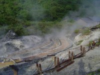 玉川温泉の源泉湧出口で、1分間にドラム缶45本分の湯が湧き出している。湧き出した98度の熱湯は、幅3メートルの湯の川となって流れている。
