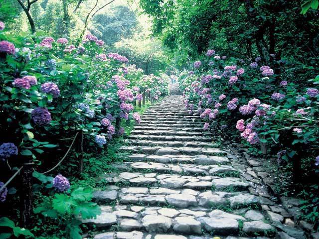 太平山のふもと、連祥院六角道から山頂の太平山神社に向かう参道は、別名あじさい坂ともいわれるほどのアジサイの名所。1000段も続く石段の両脇に、延々とアジサイが続く。