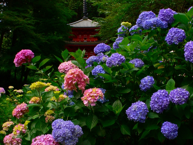 天平元(729)年に聖武天皇の勅願で行基が創建した寺。桜や紅葉の季節も美しいが、6月上旬〜7月上旬ごろのアジサイは特に有名。朱塗りの重要文化財、三重塔が目を引く。