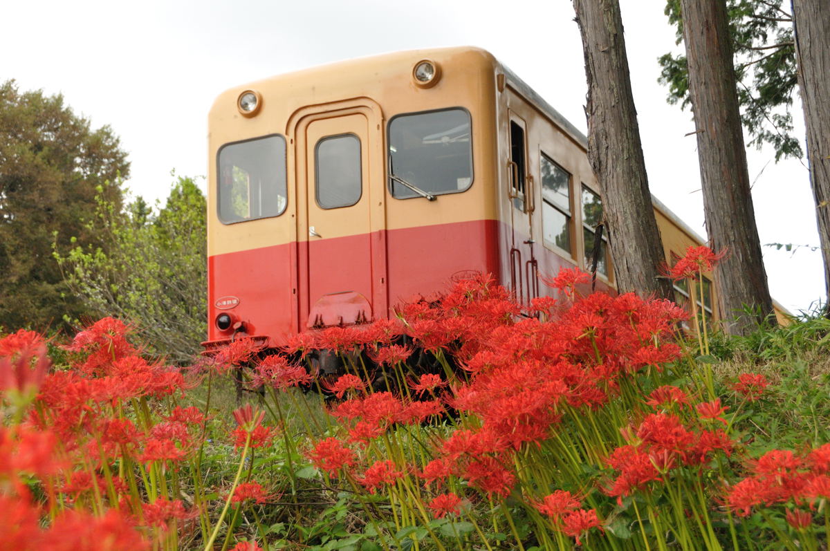 大原駅から大多喜町の上総中野駅までの14駅区間を走るいすみ鉄道。春には全線26.8kmのうち、沿線約15kmにわたり菜の花が華やかに開花する。アジサイや曼珠沙華も多く咲く。 ♪