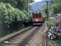 車窓に触れるほど咲き誇る沿線のあじさいを、ゆっくり走る登山電車からお楽しみください。