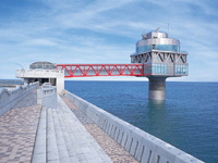 紋別沖の海に立つタワー。流氷の時期になると、海底自然観測室から流氷下の世界を目の当たりにできる。展示室では北の海の魚や流氷の妖精と呼ばれるクリオネの展示もある。