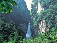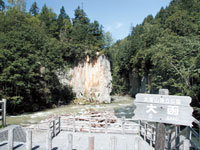 大雪山のふところ深く、渓谷に囲まれた静かな温泉郷。原生林と柱状節理の断崖が見事だ。落差約270mの羽衣の滝や幅約60mの敷島の滝を巡る遊歩道も整備されている。