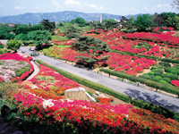 ツバキとツツジ、アジサイで有名な花の名所です。標高約321m、リフトで約3分の山頂からは、相模湾や富士山が望めます。山麓にはテニスコートや野球場のほか、恐竜の原寸大模型が配された広場もあります ♪