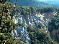十二湖の入口、世界遺産・白神山地に抱かれる大断崖。浸食崩壊によって山の斜面の白い岩肌がむき出しになり、どこか日本離れしたダイナミックな風景を展開する。