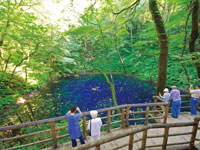 青森県の津軽国定公園にある十二湖。実際は33の湖沼が点在するが、崩山の大崩から眺めると12の湖が見えることからこの名がついた。代表的な「青池」のほか、大小の湖面がブナやカエデに彩られる光景は変化に富んでいる。十二湖南東に広がる白神山地は屋久島とともに日本初の世界自然遺産として広く知られている。
